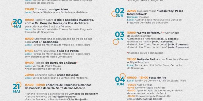 Nos fins de semana de 19 a 21, 26 a 28 de maio e 3 a 4 de junho, está de regresso o Festival Gastronómico “Peixe do Rio” em Cernache do Bonjardim, no concelho da Sertã. Promovida pelo Município da Sertã e União de Freguesias local, a iniciativa decorrerá em oito restaurantes aderentes, localizados na União de Freguesias de Cernache do Bonjardim, Nesperal e Palhais, que terão nas suas ementas diversas iguarias que apresentam o peixe do rio como principal ingrediente