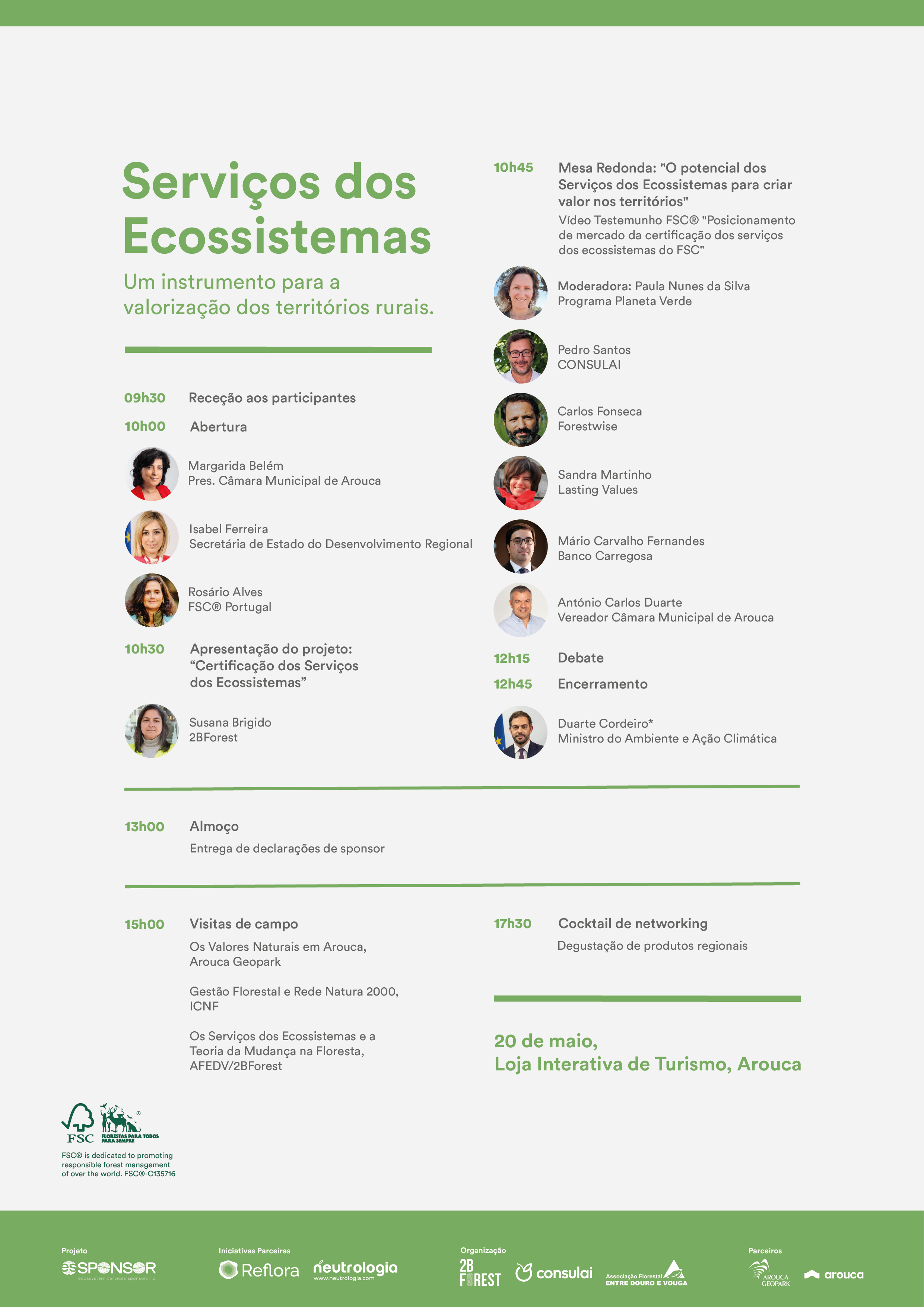 A 2BForest, Associação Florestal Entre Douro e Vouga e a Consulai organizam o evento “Serviços dos Ecossistemas-um instrumento para a valorização dos territórios rurais”, em parceria com a Câmara Municipal de Arouca e o Arouca Geopark, a realizar no dia 20 de maio, no Auditório da Loja Interativa de Turismo. O evento consistirá numa sessão em sala, da parte da manhã e uma