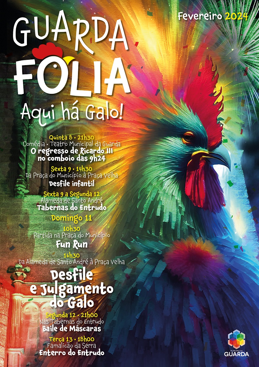 Trata-se de um carnaval genuinamente português que tem como ponto alto o Desfile e Julgamento do Galo no domingo gordo de Carnaval, a 11 de fevereiro, pelas 16h30. A sátira e o humor vão andar à solta pelas ruas do centro da cidade com o desfile das Freguesias do concelho – participam cerca de 30 nesta edição- que partem da Alameda de Santo André até à Praça Luís de Camões (Praça Velha), onde o Galo voltará a ser julgado num espetáculo que conta com a direção artística e texto original de José Rui Martins (ACERT) e com a produção executiva dos Gambozinos e Peobardos, Grupo de Teatro da Vela. A catarse guardense pretende espiar todos os males de 2023, dando esperança para o novo ano de 2024. E como sempre, de um lado vão estar os defensores do Galo e do outro os acusadores. O Julgamento terá este ano formato de “Opereta”. Como sempre, no palco deste tribunal encenado, o réu será o Galo, figura central de toda a estória, culpado de tudo e por tudo.
