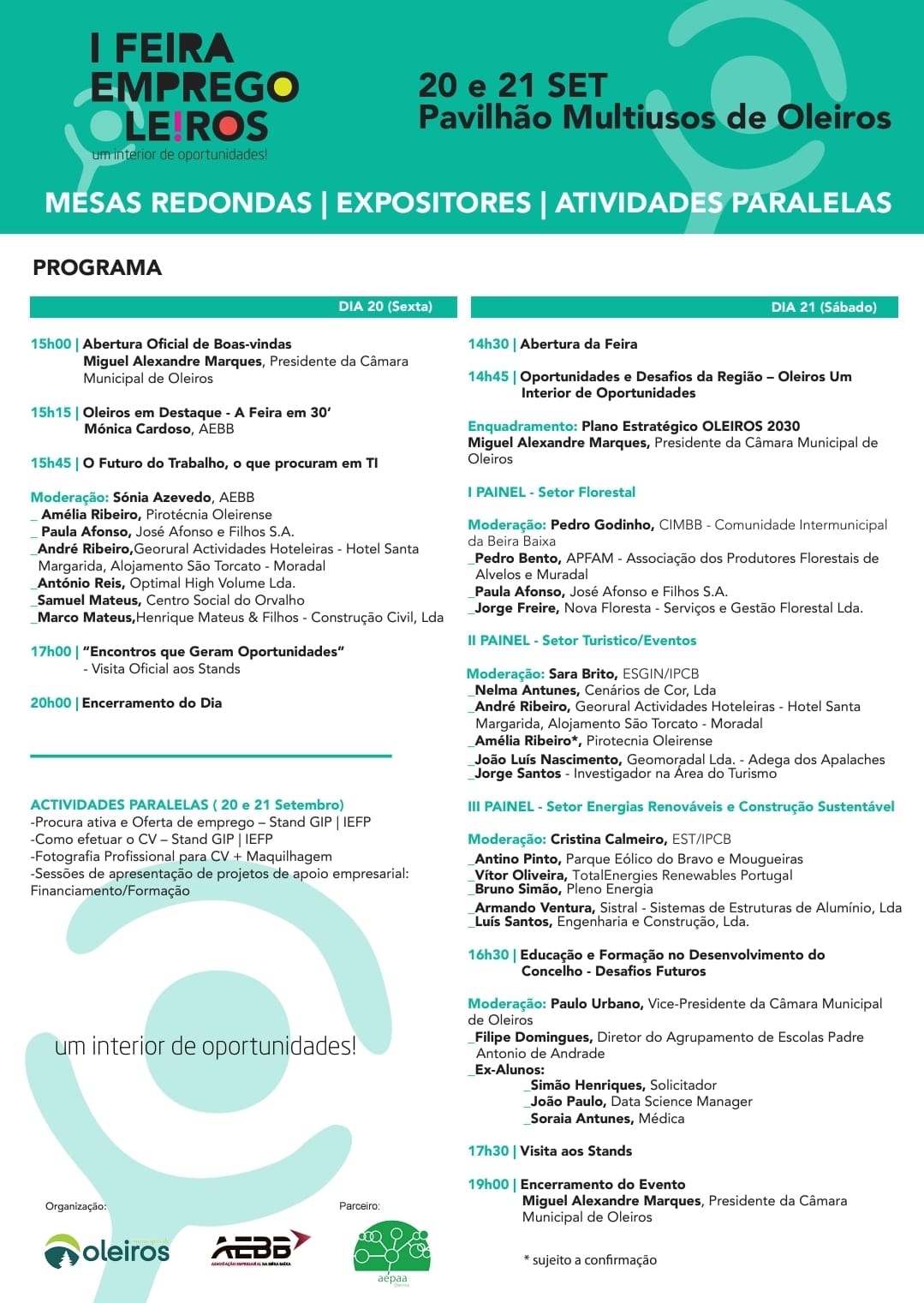 No segundo dia, o programa integra três painéis e eventos dedicados ao setor florestal, ao setor turístico, ao setor das energias renováveis e construção sustentável, áreas de grande desenvolvimento e necessidade de empregabilidade no Concelho de Oleiros