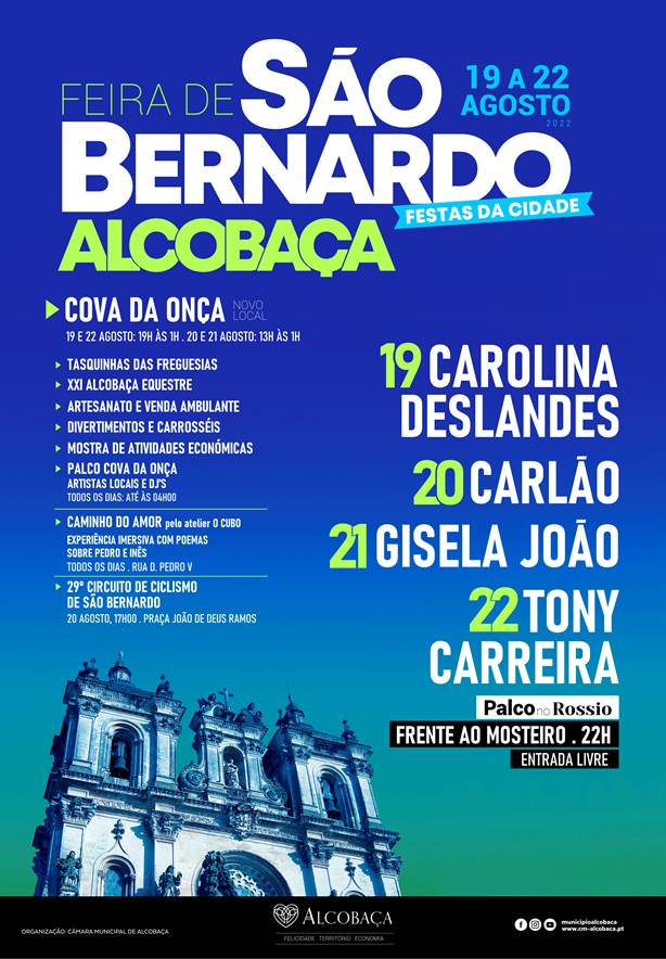 “A Feira de São Bernardo, a maior festa do concelho, é um ponto de encontro de todos os alcobacenses, de todas as freguesias. Este ano a Feira assume uma centralidade há muito desejada, entre o Rossio e a Cova da Onça. De 19 a 22 de agosto, celebraremos juntos, com muita animação, o nosso padroeiro. Visite-nos!” afirma o presidente da Câmara Municipal de Alcobaça, Hermínio Rodrigues.
