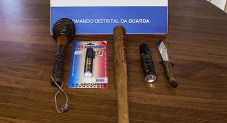 Após a realização de buscas domiciliárias, foi apreendido 1 Bastão em madeira, 1 Moca de Rio Maior, 2 Aerossóis de defesa e 1 Punhal.