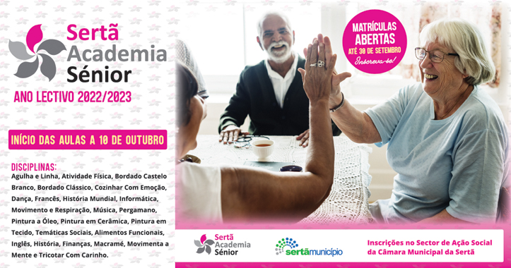 “A 10 de outubro arranca mais um ano letivo da Academia Sénior da Sertã. As matrículas estão a decorrer até 30 de setembro e poderão ser feitas na Câmara Municipal da Sertã, junto do Sector de Ação Social”, referiu, em comunicado, o município.