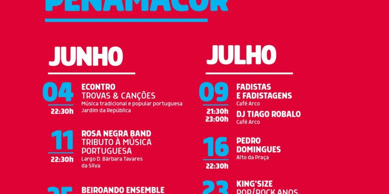 O programa arranca no dia 4 de junho, pelas 22:30, no Jardim da República, com o encontro de música tradicional e popular portuguesa Trovas & Canções, seguindo, no dia 11, pelas 22:30, com o concerto de tributo à música portuguesa pelos Rosa Negra Band, no Largo D. Bárbara Tavares da Silva.