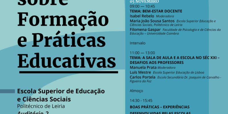 O II Encontro sobre Formação e Práticas Educativas tem início no dia 4 de novembro, pelas 17:00, com as intervenções de Pedro Morouço, diretor da ESECS, Carlos Rabadão, presidente do Politécnico de Leiria, e Olga Morouço, representante dos centros de formação. Segue-se, entre as 17:30 e as 20:30, uma apresentação sobre o tema “Desafios da Educação – Da Formação Inicial à Formação Contínua de Professores”.